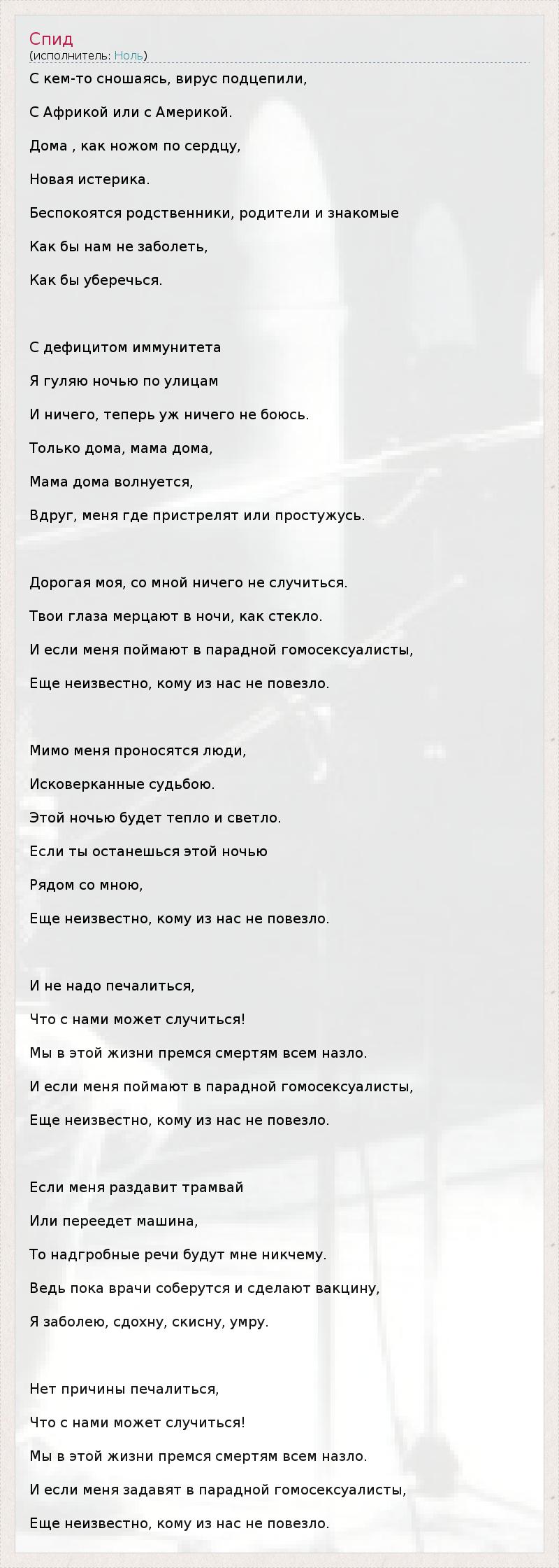 С кем-то сношаясь, вирус подцепили, С Африкой или с Америкой. Дома , как ножом по сердцу, Новая истерика. Беспокоятся родственники, родители и знакомые Как бы нам не заболеть, Как бы уберечься. С дефицитом иммунитета Я гуляю ночью по улицам И ничего, теперь уж ничего не боюсь. Только дома, мама дома, Мама дома волнуется, Вдруг, меня где пристрелят или простужусь. Дорогая моя, со мной ничего не случиться. Твои глаза мерцают в ночи, как стекло. И если меня поймают в парадной гомосексуалисты, Еще неизвестно, кому из нас не повезло. Мимо меня проносятся люди, Исковерканные судьбою. Этой ночью будет тепло и светло. Если ты останешься этой ночью Рядом со мною, Еще неизвестно, кому из нас не повезло. И не надо печалиться, Что с нами может случиться! Мы в этой жизни премся смертям всем назло. И если меня поймают в парадной гомосексуалисты, Еще неизвестно, кому из нас не повезло. Если меня раздавит трамвай Или переедет машина, То надгробные речи будут мне никчему. Ведь пока врачи соберутся и сделают вакцину, Я заболею, сдохну, скисну, умру. Нет причины печалиться, Что с нами может случиться! Мы в этой жизни премся смертям всем назло. И если меня задавят в парадной гомосексуалисты, Еще неизвестно, кому из нас не повезло.