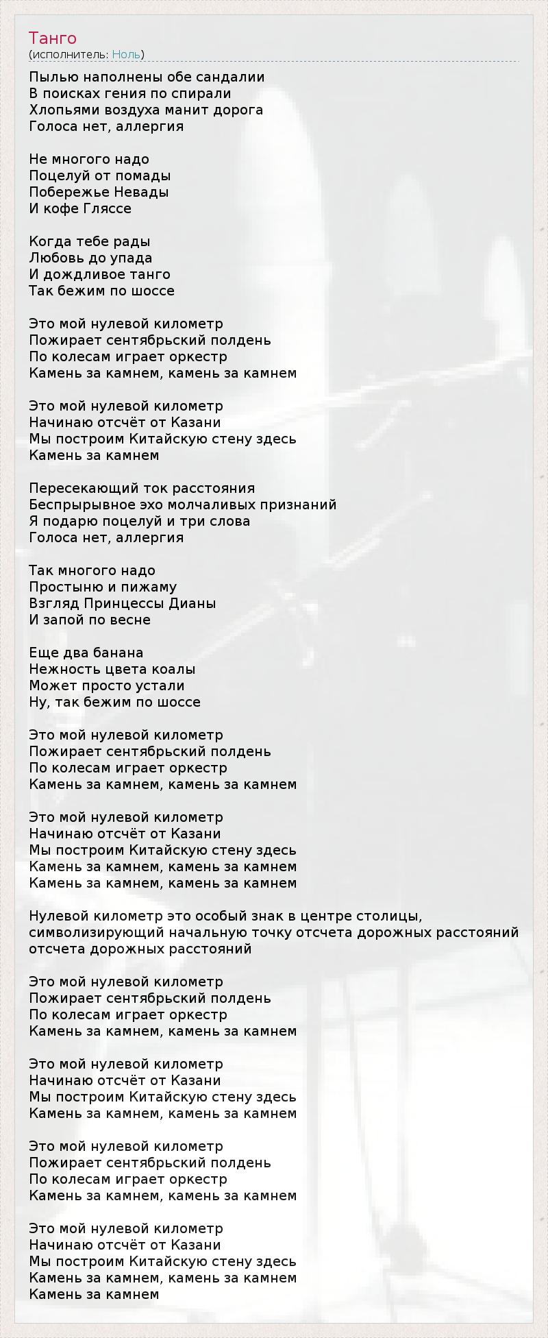 Пылью наполнены обе сандалии В поисках гения по спирали Хлопьями воздуха манит дорога Голоса нет, аллергия Не многого надо Поцелуй от помады Побережье Невады И кофе Гляссе Когда тебе рады Любовь до упада И дождливое танго Так бежим по шоссе Это мой нулевой километр Пожирает сентябрьский полдень По колесам играет оркестр Камень за камнем, камень за камнем Это мой нулевой километр Начинаю отсчёт от Казани Мы построим Китайскую стену здесь Камень за камнем Пересекающий ток расстояния Беспрырывное эхо молчаливых признаний Я подарю поцелуй и три слова Голоса нет, аллергия Так многого надо Простыню и пижаму Взгляд Принцессы Дианы И запой по весне Еще два банана Нежность цвета коалы Может просто устали Ну, так бежим по шоссе Это мой нулевой километр Пожирает сентябрьский полдень По колесам играет оркестр Камень за камнем, камень за камнем Это мой нулевой километр Начинаю отсчёт от Казани Мы построим Китайскую стену здесь Камень за камнем, камень за камнем Камень за камнем, камень за камнем Нулевой километр это особый знак в центре столицы, символизирующий начальную точку отсчета дорожных расстояний отсчета дорожных расстояний Это мой нулевой километр Пожирает сентябрьский полдень По колесам играет оркестр Камень за камнем, камень за камнем Это мой нулевой километр Начинаю отсчёт от Казани Мы построим Китайскую стену здесь Камень за камнем, камень за камнем Это мой нулевой километр Пожирает сентябрьский полдень По колесам играет оркестр Камень за камнем, камень за камнем Это мой нулевой километр Начинаю отсчёт от Казани Мы построим Китайскую стену здесь Камень за камнем, камень за камнем Камень за камнем