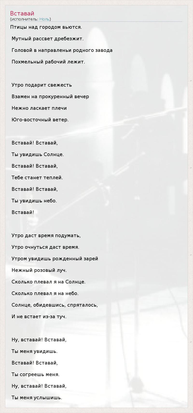 Птицы над городом вьются. Мутный рассвет дребезжит. Головой в направленьи родного завода Похмельный рабочий лежит. Утро подарит свежесть Взамен на прокуренный вечер Нежно ласкает плечи Юго-восточный ветер. Вставай! Вставай, Ты увидишь Солнце. Вставай! Вставай, Тебе станет теплей. Вставай! Вставай, Ты увидишь небо. Вставай! Утро даст время подумать, Утро очнуться даст время. Утром увидишь рожденный зарей Нежный розовый луч. Сколько плевал я на Солнце. Сколько плевал я на небо. Солнце, обидевшись, спряталось, И не встает из-за туч. Ну, вставай! Вставай, Ты меня увидишь. Вставай! Вставай, Ты согреешь меня. Ну, вставай! Вставай, Ты меня услышишь.