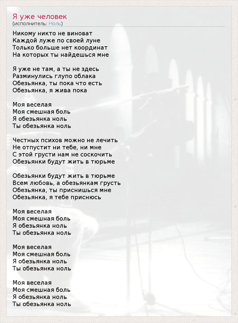 Никому никто не виноват Каждой луже по своей луне Только больше нет координат На которых ты найдешься мне Я уже не там, а ты не здесь Разминулись глупо облака Обезьянка, ты пока что есть Обезьянка, я жива пока Моя веселая Моя смешная боль Я обезьянка ноль Ты обезьянка ноль Честных психов можно не лечить Не отпустит ни тебе, ни мне С этой грусти нам не соскочить Обезьянки будут жить в тюрьме Обезьянки будут жить в тюрьме Всем любовь, а обезьянкам грусть Обезьянка, ты приснишься мне Обезьянка, я тебе приснюсь Моя веселая Моя смешная боль Я обезьянка ноль Ты обезьянка ноль Моя веселая Моя смешная боль Я обезьянка ноль Ты обезьянка ноль Моя веселая Моя смешная боль Я обезьянка ноль Ты обезьянка ноль
