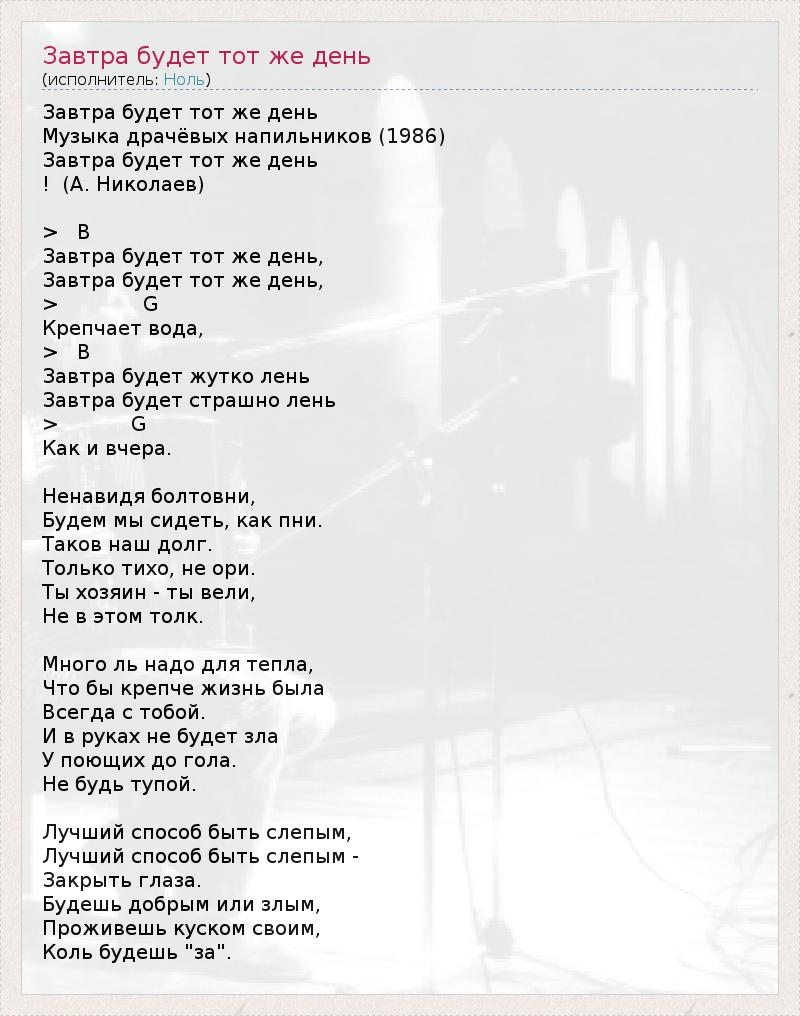 Завтра будет тот же день Музыка драчёвых напильников (1986) Завтра будет тот же день ! (А. Николаев) > B Завтра будет тот же день, Завтра будет тот же день, > G Крепчает вода, > B Завтра будет жутко лень Завтра будет страшно лень > G Как и вчера. Ненавидя болтовни, Будем мы сидеть, как пни. Таков наш долг. Только тихо, не ори. Ты хозяин - ты вели, Не в этом толк. Много ль надо для тепла, Что бы крепче жизнь была Всегда с тобой. И в руках не будет зла У поющих до гола. Не будь тупой. Лучший способ быть слепым, Лучший способ быть слепым - Закрыть глаза. Будешь добрым или злым, Проживешь куском своим, Коль будешь "за".