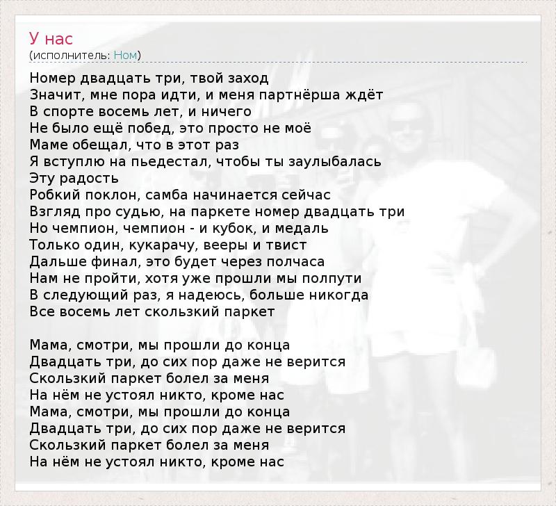 Номер двадцать три, твой заход Значит, мне пора идти, и меня партнёрша ждёт В спорте восемь лет, и ничего Не было ещё побед, это просто не моё Маме обещал, что в этот раз Я вступлю на пьедестал, чтобы ты заулыбалась Эту радость Робкий поклон, самба начинается сейчас Взгляд про судью, на паркете номер двадцать три Но чемпион, чемпион - и кубок, и медаль Только один, кукарачу, вееры и твист Дальше финал, это будет через полчаса Нам не пройти, хотя уже прошли мы полпути В следующий раз, я надеюсь, больше никогда Все восемь лет скользкий паркет Мама, смотри, мы прошли до конца Двадцать три, до сих пор даже не верится Скользкий паркет болел за меня На нём не устоял никто, кроме нас Мама, смотри, мы прошли до конца Двадцать три, до сих пор даже не верится Скользкий паркет болел за меня На нём не устоял никто, кроме нас