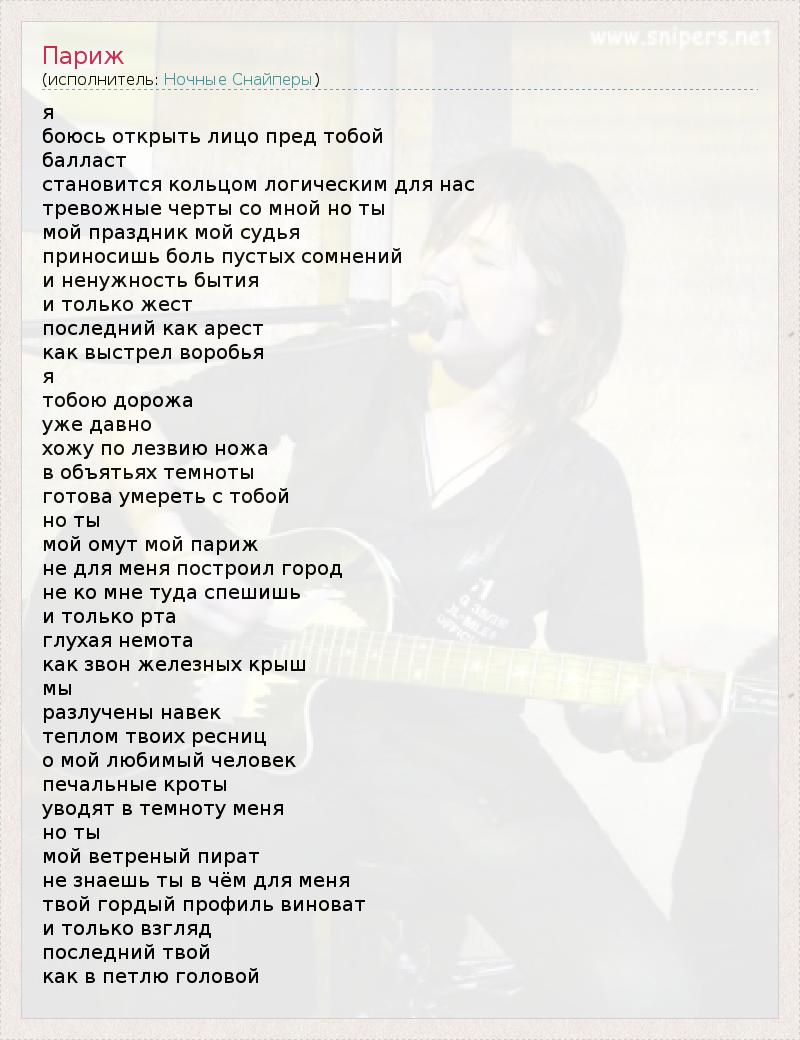 я боюсь открыть лицо пред тобой балласт становится кольцом логическим для нас тревожные черты со мной но ты мой праздник мой судья приносишь боль пустых сомнений и ненужность бытия и только жест последний как арест как выстрел воробья я тобою дорожа уже давно хожу по лезвию ножа в объятьях темноты готова умереть с тобой но ты мой омут мой париж не для меня построил город не ко мне туда спешишь и только рта глухая немота как звон железных крыш мы разлучены навек теплом твоих ресниц о мой любимый человек печальные кроты уводят в темноту меня но ты мой ветреный пират не знаешь ты в чём для меня твой гордый профиль виноват и только взгляд последний твой как в петлю головой