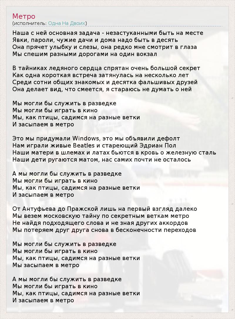 Наша с ней основная задача - незастуканными быть на месте Явки, пароли, чужие дачи и дома надо быть в десять Она прячет улыбку и слезы, она редко мне смотрит в глаза Мы спешим разными дорогами на один вокзал В тайниках ледяного сердца спрятан очень большой секрет Как одна короткая встреча затянулась на несколько лет Среди сотни общих знакомых и десятка фальшивых друзей Она делает вид, что смеется, я стараюсь не думать о ней Мы могли бы служить в разведке Мы могли бы играть в кино Мы, как птицы, садимся на разные ветки И засыпаем в метро Это мы придумали Windows, это мы объявили дефолт Нам играли живые Beatles и стареющий Эдриан Пол Наши матери в шлемах и латах бьются в кровь о железную сталь Наши дети ругаются матом, нас самих почти не осталось А мы могли бы служить в разведке Мы могли бы играть в кино Мы, как птицы, садимся на разные ветки И засыпаем в метро От Антуфьева до Пражской лишь на первый взгляд далеко Мы везем московскую тайну по секретным веткам метро Не найдя подходящего слова и не зная других аккордов Мы потеряем друг друга снова в бесконечности переходов Мы могли бы служить в разведке Мы могли бы играть в кино Мы, как птицы, садимся на разные ветки Мы засыпаем в метро А мы могли бы служить в разведке Мы могли бы играть в кино Мы, как птицы, садимся на разные ветки И засыпаем в метро