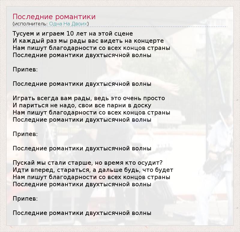 ГлавнаяИсполнителиОдна На ДвоихПоследние романтики