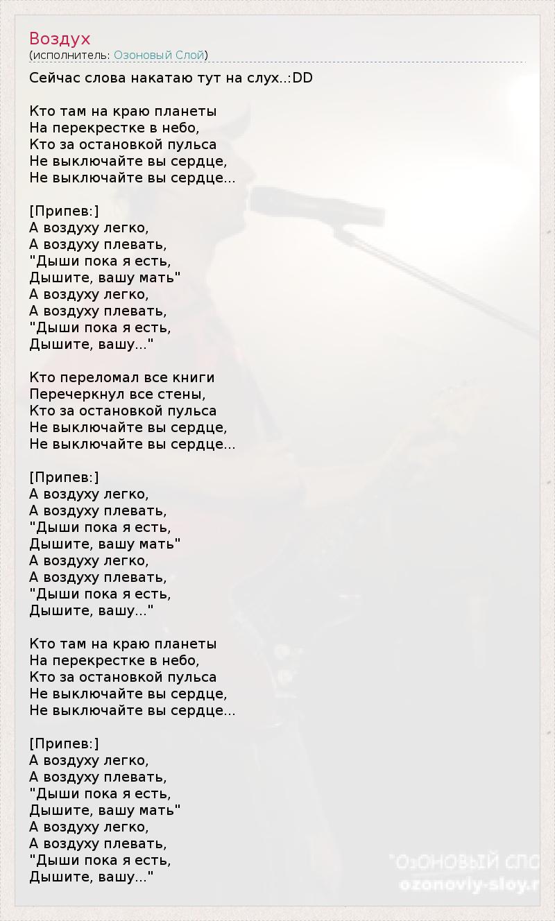 Сейчас слова накатаю тут на слух..:DD Кто там на краю планеты На перекрестке в небо, Кто за остановкой пульса Не выключайте вы сердце, Не выключайте вы сердце... [Припев:] А воздуху легко, А воздуху плевать, "Дыши пока я есть, Дышите, вашу мать" А воздуху легко, А воздуху плевать, "Дыши пока я есть, Дышите, вашу..." Кто переломал все книги Перечеркнул все стены, Кто за остановкой пульса Не выключайте вы сердце, Не выключайте вы сердце... [Припев:] А воздуху легко, А воздуху плевать, "Дыши пока я есть, Дышите, вашу мать" А воздуху легко, А воздуху плевать, "Дыши пока я есть, Дышите, вашу..." Кто там на краю планеты На перекрестке в небо, Кто за остановкой пульса Не выключайте вы сердце, Не выключайте вы сердце... [Припев:] А воздуху легко, А воздуху плевать, "Дыши пока я есть, Дышите, вашу мать" А воздуху легко, А воздуху плевать, "Дыши пока я есть, Дышите, вашу..."