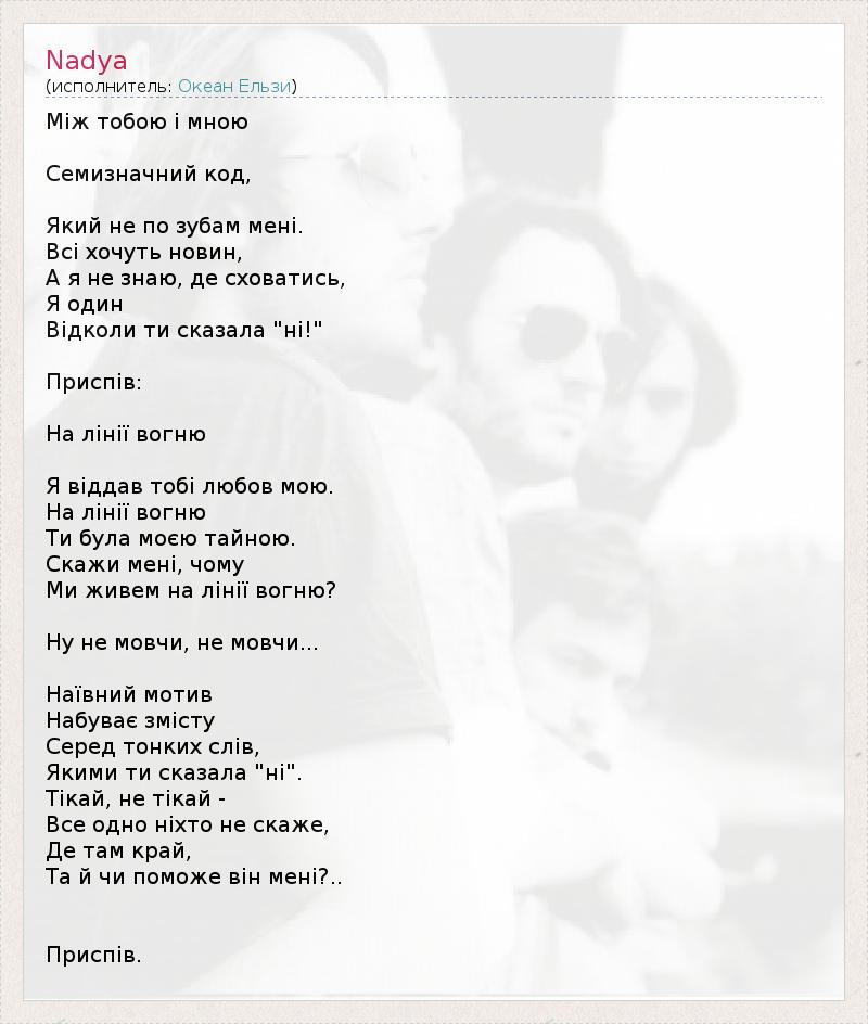 Між тобою і мною Семизначний код, Який не по зубам мені. Всі хочуть новин, А я не знаю, де сховатись, Я один Відколи ти сказала "ні!" Приспів: На лінії вогню Я віддав тобі любов мою. На лінії вогню Ти була моєю тайною. Скажи мені, чому Ми живем на лінії вогню? Ну не мовчи, не мовчи... Наївний мотив Набуває змісту Серед тонких слів, Якими ти сказала "ні". Тікай, не тікай - Все одно ніхто не скаже, Де там край, Та й чи поможе він мені?.. Приспів.