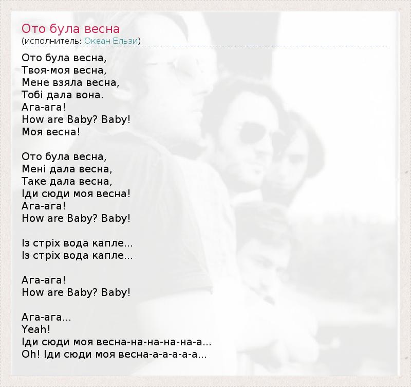 Это интересно:Океан Ельзи — наиболее известная и титулованная украинская рок-группа. Океан Ельзи признаны поклонниками и критиками как лучшая рок- и live-группа СНГ. О. Е. — это яркая экспрессия, глубокий текст, оригинальный стиль, концертный драйв и впечатляющая энергетика. Группа «Океан Ельзи» родилась во Львове в 1994 году. А уже в 1996 музыканты выступили... продолжение