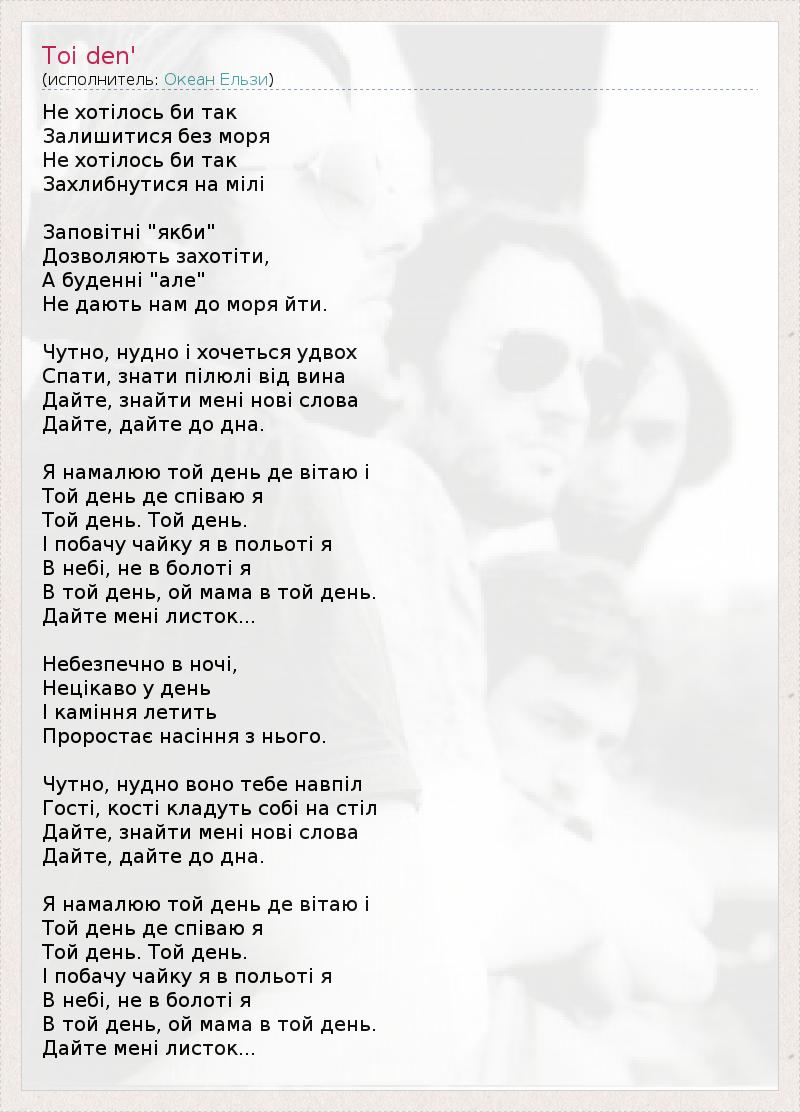 Это интересно:Океан Ельзи — наиболее известная и титулованная украинская рок-группа. Океан Ельзи признаны поклонниками и критиками как лучшая рок- и live-группа СНГ. О. Е. — это яркая экспрессия, глубокий текст, оригинальный стиль, концертный драйв и впечатляющая энергетика. Группа «Океан Ельзи» родилась во Львове в 1994 году. А уже в 1996 музыканты выступили... продолжение