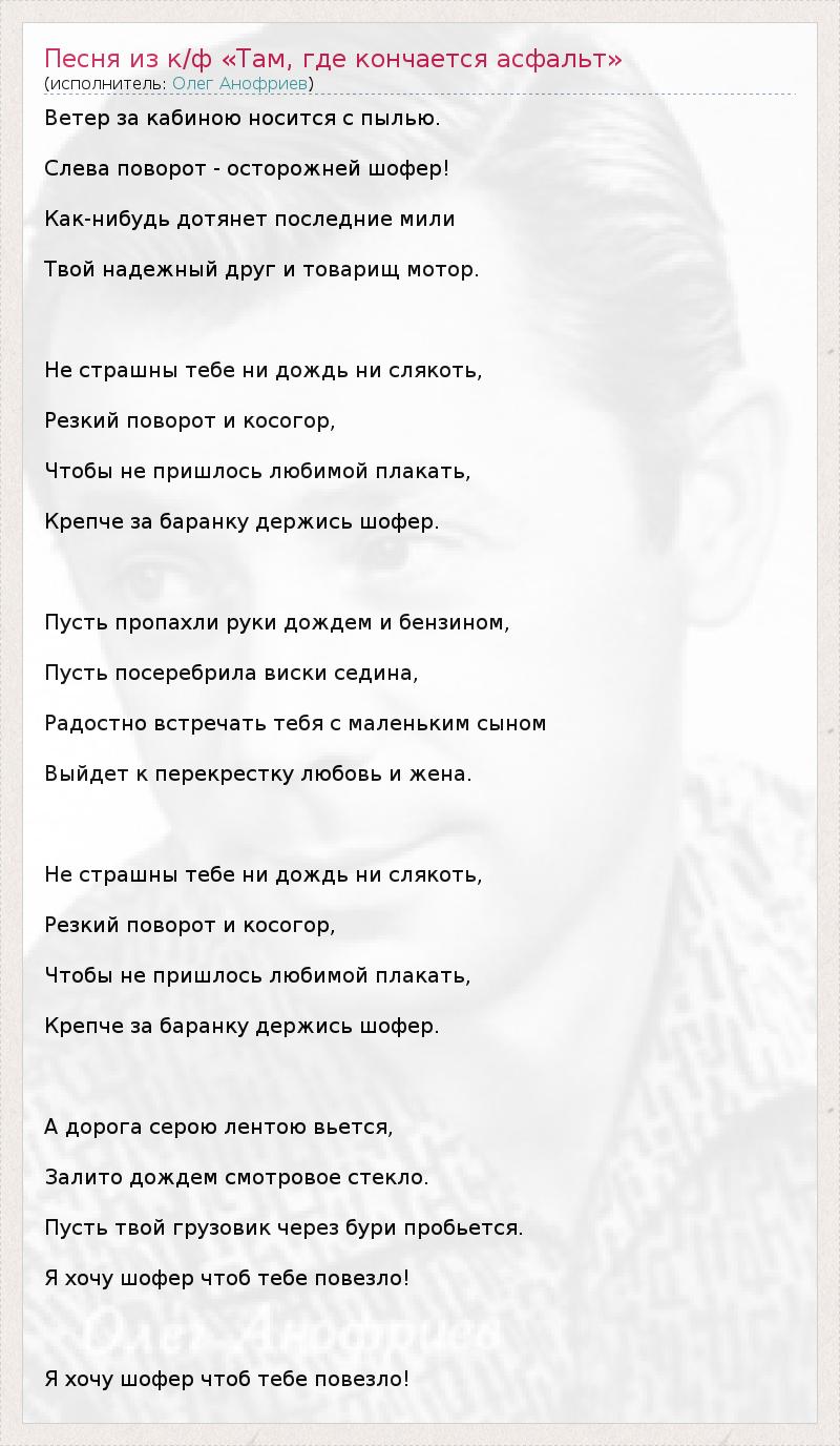 ГлавнаяИсполнителиОлег АнофриевПесня из к/ф «Там, где кончается асфальт»