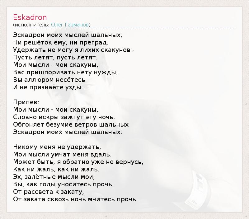 Эскадрон моих мыслей шальных, Ни решёток ему, ни преград. Удержать не могу я лихих скакунов - Пусть летят, пусть летят. Мои мысли - мои скакуны, Вас пришпоривать нету нужды, Вы аллюром несётесь И не признаёте узды. Припев: Мои мысли - мои скакуны, Словно искры зажгут эту ночь. Обгоняет безумие ветров шальных Эскадрон моих мыслей шальных. Никому меня не удержать, Мои мысли умчат меня вдаль. Может быть, я обратно уже не вернусь, Как ни жаль, как ни жаль. Эх, залётные мысли мои, Вы, как годы уноситесь прочь. От рассвета к закату, От заката сквозь ночь мчитесь прочь.