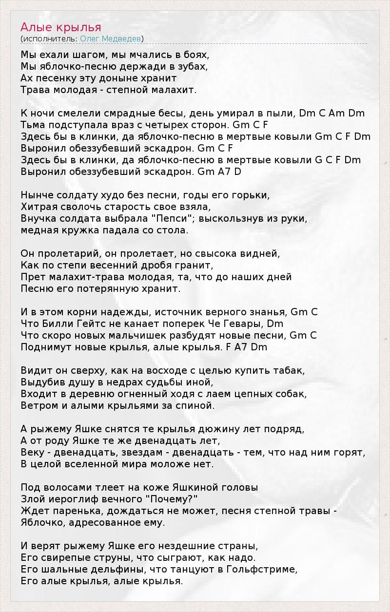 We went a step , we raced in the fighting, We derzhadi apple - song in the teeth , Oh this song to this day keeps Young grass - steppe malachite . By nightfall smeleli stinking demons day dying in the dust , Dm C Am Dm Darkness rises from four sides at once . Gm C F There would blades, yes apple - song in the dead grasses Gm CF Dm Obezzubevshy squadron dropped . Gm C F There would blades, yes apple - song in the dead grasses GCF Dm Obezzubevshy squadron dropped . Gm A7 D Today evil soldier without a song , during his bitter Sly bastard took his old age , Granddaughter soldier chose " Pepsi " ; slipped out of his hands , copper mug falling off the table. He proletarian, he flies , but down know better , As the steppe spring crushing granite, Pret - malachite young grass , one that to this day Song lost its stores . And in this the roots of hope , a source of accurate knowledge , Gm C Bill Gates no channel across Che Guevara , Dm As soon awaken new boys new songs , Gm C Raise new wings , scarlet wings. F A7 Dm Sees it from above, as at sunrise with a view to buy tobacco Vydubiv soul in the depths of the fate of another , Enters a village fire continued walking , barking dogs , Wind and scarlet wings on his back . A redhead Yashke dream about those wings a dozen years in a row , And old Yashke same twelve years , Century - twelve stars - twelve - that above it burn In the whole universe there is no peace younger . Smolders under the hair on the skin of the head Yashkino Evil character eternal "Why?" Waiting for the boy, can not wait , the song of the steppe grass - Apple, addressed to him . And believe redhead Yashke his otherworldly country His ferocious strings that play the right way. His crazy dolphins that dance in the Gulf Stream , His scarlet wings , scarlet wings.
