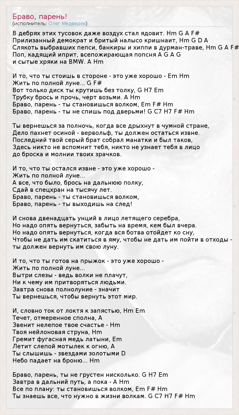 Bravo , man - you do not sleep under the doors ! G C7 H7 F # ​​Hm