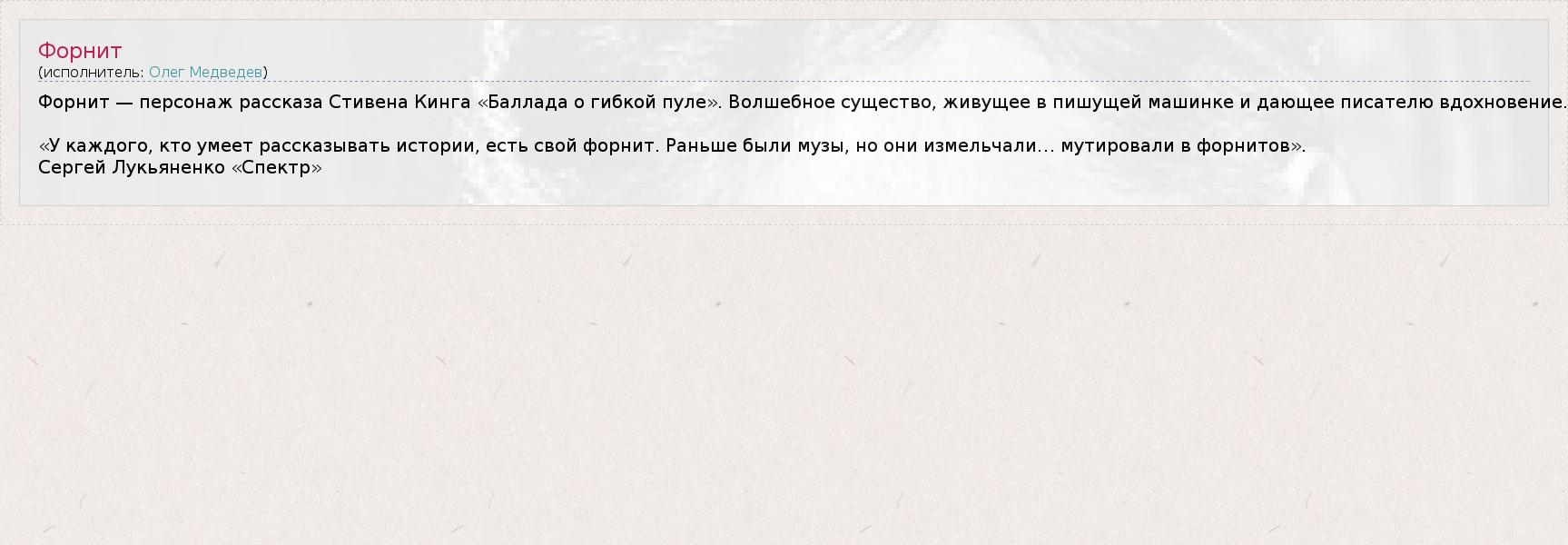 Форнит — персонаж рассказа Стивена Кинга «Баллада о гибкой пуле». Волшебное существо, живущее в пишущей машинке и дающее писателю вдохновение.