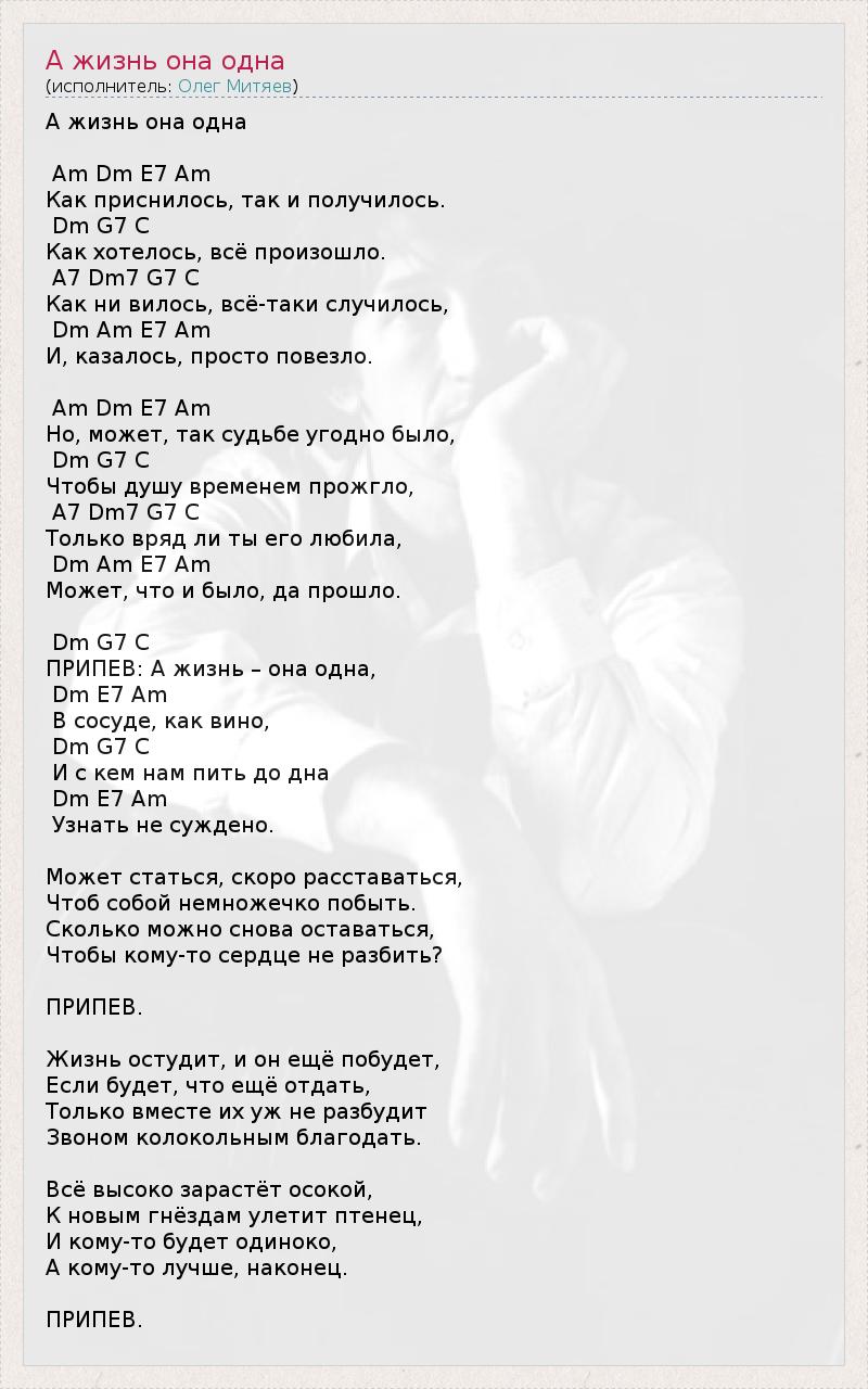 А жизнь она одна Am Dm E7 Am Как приснилось, так и получилось. Dm G7 C Как хотелось, всё произошло. A7 Dm7 G7 C Как ни вилось, всё-таки случилось, Dm Am E7 Am И, казалось, просто повезло. Am Dm E7 Am Но, может, так судьбе угодно было, Dm G7 C Чтобы душу временем прожгло, A7 Dm7 G7 C Только вряд ли ты его любила, Dm Am E7 Am Может, что и было, да прошло. Dm G7 C ПРИПЕВ: А жизнь – она одна, Dm E7 Am В сосуде, как вино, Dm G7 C И с кем нам пить до дна Dm E7 Am Узнать не суждено. Может статься, скоро расставаться, Чтоб собой немножечко побыть. Сколько можно снова оставаться, Чтобы кому-то сердце не разбить? ПРИПЕВ. Жизнь остудит, и он ещё побудет, Если будет, что ещё отдать, Только вместе их уж не разбудит Звоном колокольным благодать. Всё высоко зарастёт осокой, К новым гнёздам улетит птенец, И кому-то будет одиноко, А кому-то лучше, наконец. ПРИПЕВ.