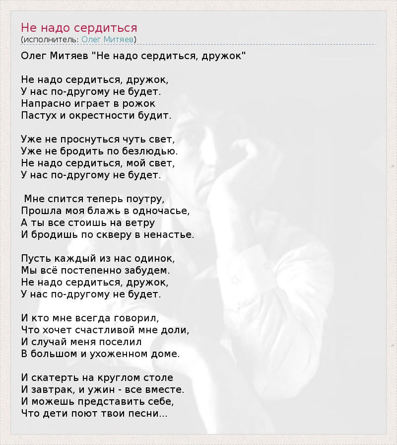 ГлавнаяИсполнителиОлег МитяевНе надо сердиться