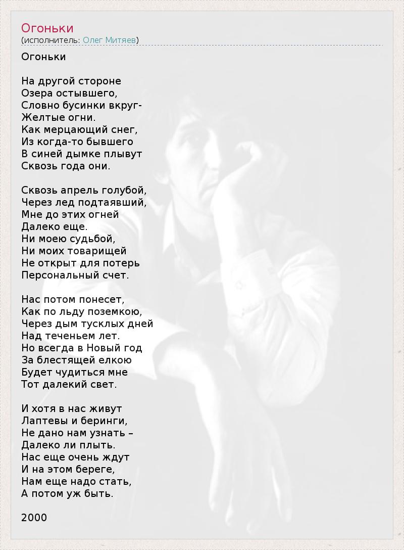 Огоньки На другой стороне Озера остывшего, Словно бусинки вкруг- Желтые огни. Как мерцающий снег, Из когда-то бывшего В синей дымке плывут Сквозь года они. Сквозь апрель голубой, Через лед подтаявший, Мне до этих огней Далеко еще. Ни моею судьбой, Ни моих товарищей Не открыт для потерь Персональный счет. Нас потом понесет, Как по льду поземкою, Через дым тусклых дней Над теченьем лет. Но всегда в Новый год За блестящей елкою Будет чудиться мне Тот далекий свет. И хотя в нас живут Лаптевы и беринги, Не дано нам узнать – Далеко ли плыть. Нас еще очень ждут И на этом береге, Нам еще надо стать, А потом уж быть. 2000