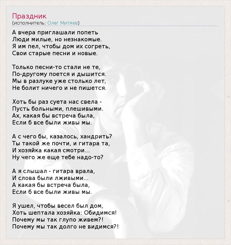 Это интересно:Заслуженный артист России, член Союза писателей, Лауреат национальной премии «Овация», Лауреат премий Фонда русской поэзии, премии «Золотой Остап».Для туристов и компанейской публики Митяев — это «Как здорово, что все мы здесь сегодня собрались». Для публики ресторанной он — «Ненаточенные ножи» и другие песни из репертуара М. Шуфутинского. Из тех кто любит авторскую песню, одни... продолжение
