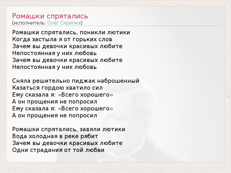ГлавнаяИсполнителиОлег СкрипкаРомашки спрятались