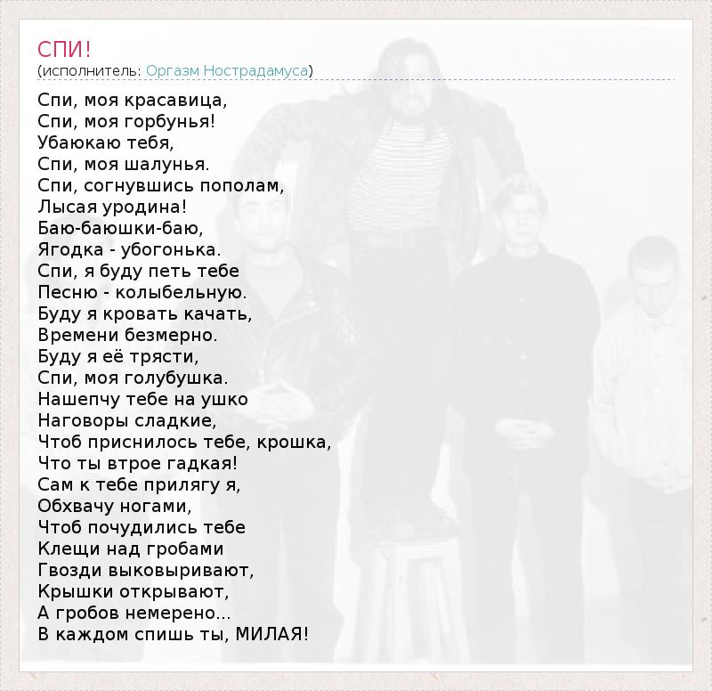 Спи, моя красавица, Спи, моя горбунья! Убаюкаю тебя, Спи, моя шалунья. Спи, согнувшись пополам, Лысая уродина! Баю-баюшки-баю, Ягодка - убогонька. Спи, я буду петь тебе Песню - колыбельную. Буду я кровать качать, Времени безмерно. Буду я её трясти, Спи, моя голубушка. Нашепчу тебе на ушко Наговоры сладкие, Чтоб приснилось тебе, крошка, Что ты втрое гадкая! Сам к тебе прилягу я, Обхвачу ногами, Чтоб почудились тебе Клещи над гробами Гвозди выковыривают, Крышки открывают, А гробов немерено... В каждом спишь ты, МИЛАЯ!