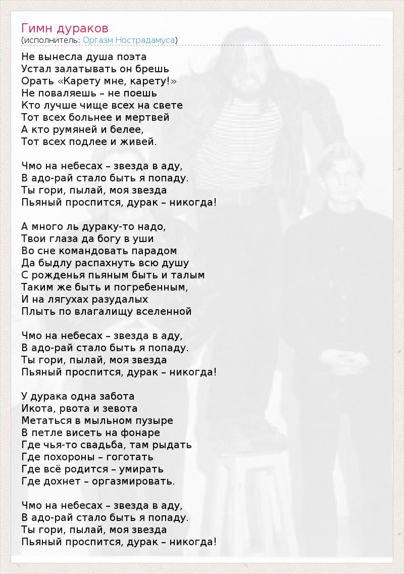 Не вынесла душа поэта Устал залатывать он брешь Орать «Карету мне, карету!» Не поваляешь – не поешь Кто лучше чище всех на свете Тот всех больнее и мертвей А кто румяней и белее, Тот всех подлее и живей. Чмо на небесах – звезда в аду, В адо-рай стало быть я попаду. Ты гори, пылай, моя звезда Пьяный проспится, дурак – никогда! А много ль дураку-то надо, Твои глаза да богу в уши Во сне командовать парадом Да быдлу распахнуть всю душу С рожденья пьяным быть и талым Таким же быть и погребенным, И на лягухах разудалых Плыть по влагалищу вселенной Чмо на небесах – звезда в аду, В адо-рай стало быть я попаду. Ты гори, пылай, моя звезда Пьяный проспится, дурак – никогда! У дурака одна забота Икота, рвота и зевота Метаться в мыльном пузыре В петле висеть на фонаре Где чья-то свадьба, там рыдать Где похороны – гоготать Где всё родится – умирать Где дохнет – оргазмировать. Чмо на небесах – звезда в аду, В адо-рай стало быть я попаду. Ты гори, пылай, моя звезда Пьяный проспится, дурак – никогда!