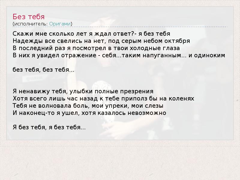 Скажи мне сколько лет я ждал ответ?- я без тебя Надежды все свелись на нет, под серым небом октября В последний раз я посмотрел в твои холодные глаза В них я увидел отражение - себя...таким напуганным... и одиноким без тебя, без тебя... Я ненавижу тебя, улыбки полные презрения Хотя всего лишь час назад к тебе приполз бы на коленях Тебя не волновала боль, мои упреки, мои слезы И наконец-то я ушел, хотя казалось невозможно Я без тебя, я без тебя...