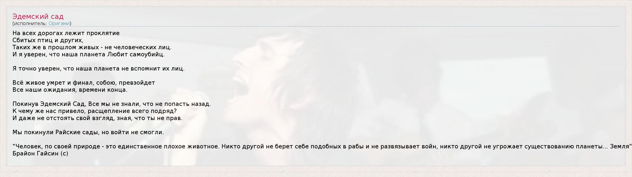На всех дорогах лежит проклятие Сбитых птиц и других, Таких же в прошлом живых - не человеческих лиц. И я уверен, что наша планета Любит самоубийц. Я точно уверен, что наша планета не вспомнит их лиц. Всё живое умрет и финал, собою, превзойдет Все наши ожидания, времени конца. Покинув Эдемский Сад, Все мы не знали, что не попасть назад. К чему же нас привело, расщепление всего подряд? И даже не отстоять свой взгляд, зная, что ты не прав. Мы покинули Райские сады, но войти не смогли. "Человек, по своей природе - это единственное плохое животное. Никто другой не берет себе подобных в рабы и не развязывает войн, никто другой не угрожает существованию планеты... Земля" Брайон Гайсин (с)