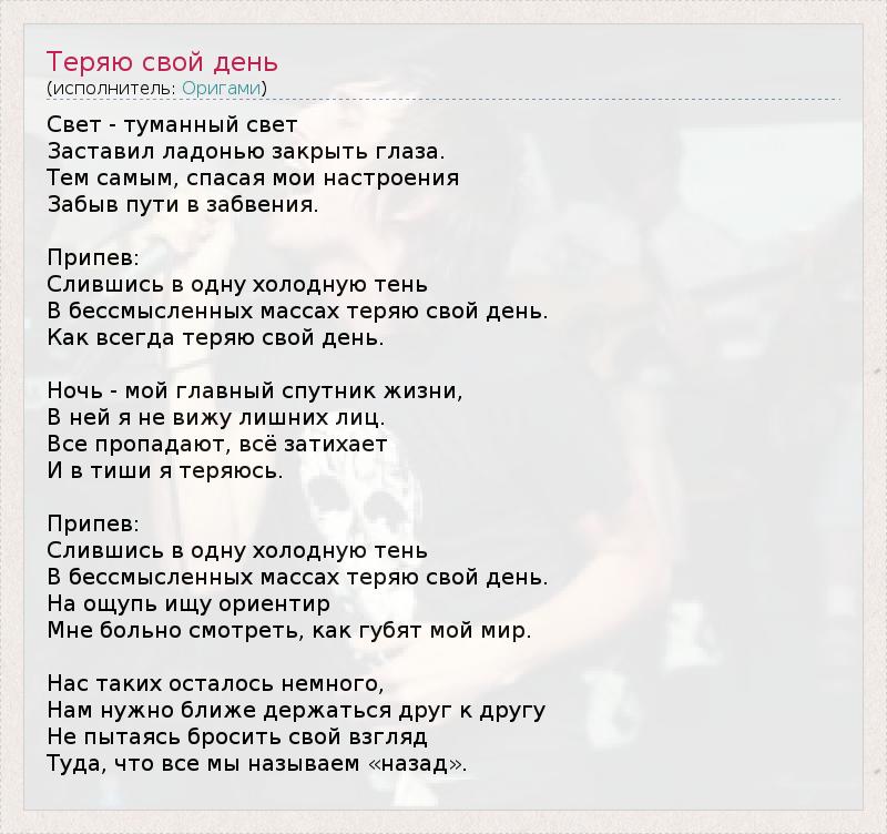 Оригами - Теряю свой день - Текст песни, слушать онлайн Оригами - Теряю свой день - Текст песни, слушать онлайн