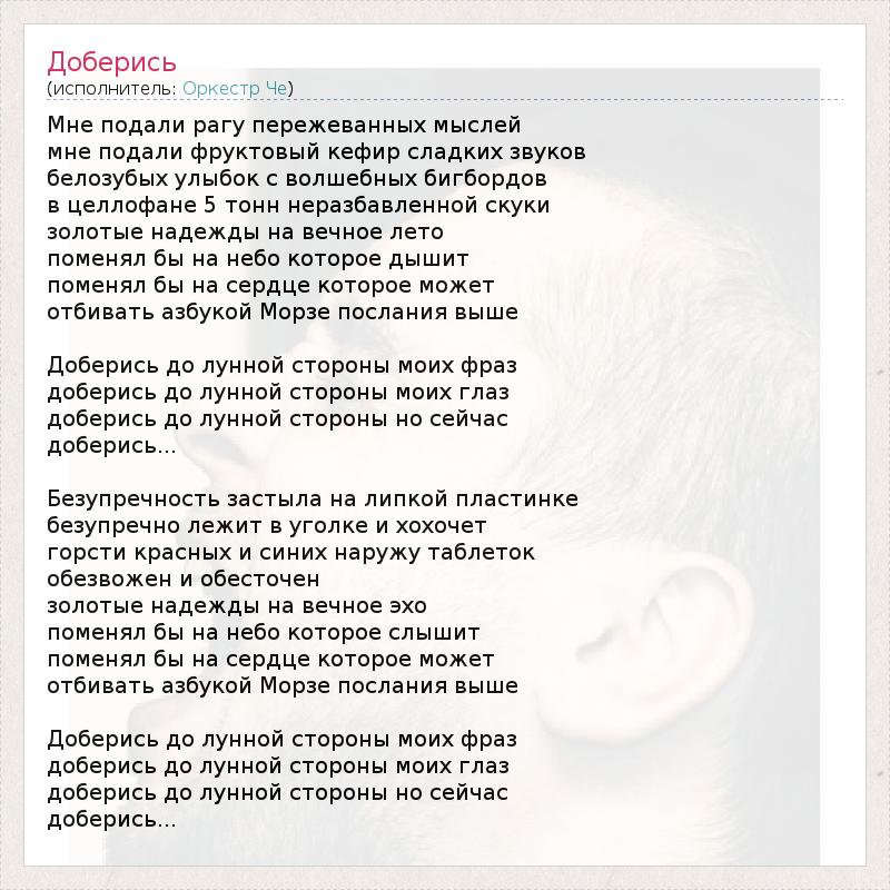 Это интересно:Одна из самых ярких и замечательных групп в городе Харькове."Оркестр Че, как боевую единицу, можно спокойно забрасывать в тыл врага, как сильнодействующее психотропное средство, способное ввергнуть в шоковое состояние целую армию".Стиль visual art rock. Образовалась в 2002 году. На вечерних сейшнах в общежитии театрального института познакомились Олег Каданов (солист, автор песен),... продолжение
