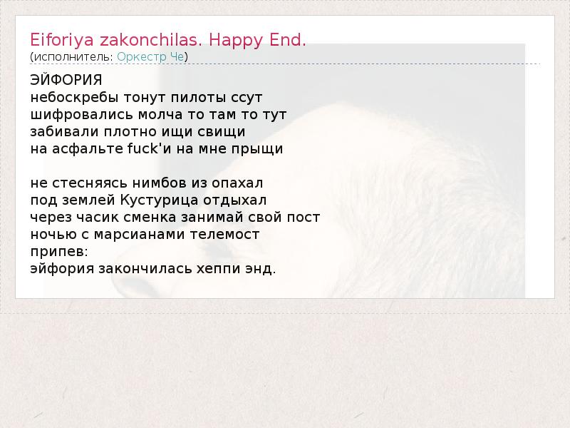 А как ты думаешь, о чем песня "Eiforiya zakonchilas. Happy End." ?
