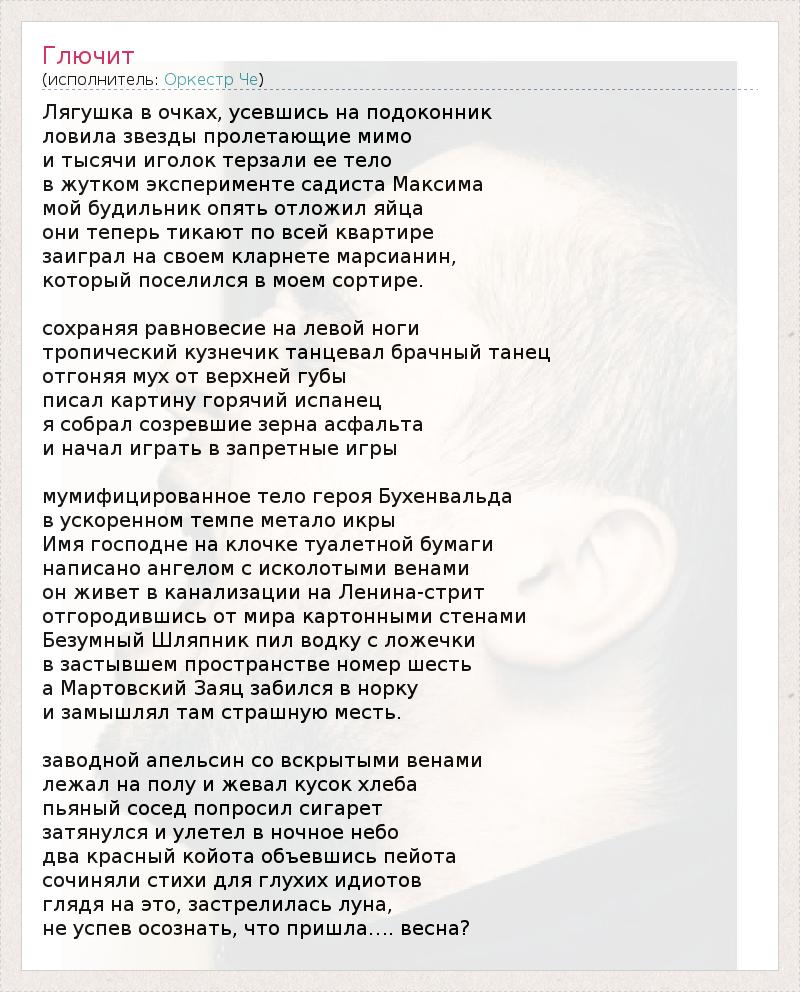 Это интересно:Одна из самых ярких и замечательных групп в городе Харькове."Оркестр Че, как боевую единицу, можно спокойно забрасывать в тыл врага, как сильнодействующее психотропное средство, способное ввергнуть в шоковое состояние целую армию".Стиль visual art rock. Образовалась в 2002 году. На вечерних сейшнах в общежитии театрального института познакомились Олег Каданов (солист, автор песен),... продолжение