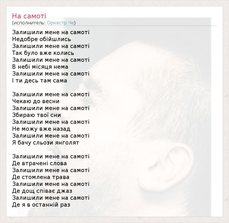 Залишили мене на самоті Недобре обійшлись Залишили мене на самоті Так було вже колись Залишили мене на самоті В небі місяця нема Залишили мене на самоті І ти десь там сама Залишили мене на самоті Чекаю до весни Залишили мене на самоті Збираю твої сни Залишили мене на самоті Не можу вже назад Залишили мене на самоті Я бачу сльози янголят Залишили мене на самоті Де втрачені слова Залишили мене на самоті Де стомлена трава Залишили мене на самоті Де дощ співає джаз Залишили мене на самоті Де я в останній раз