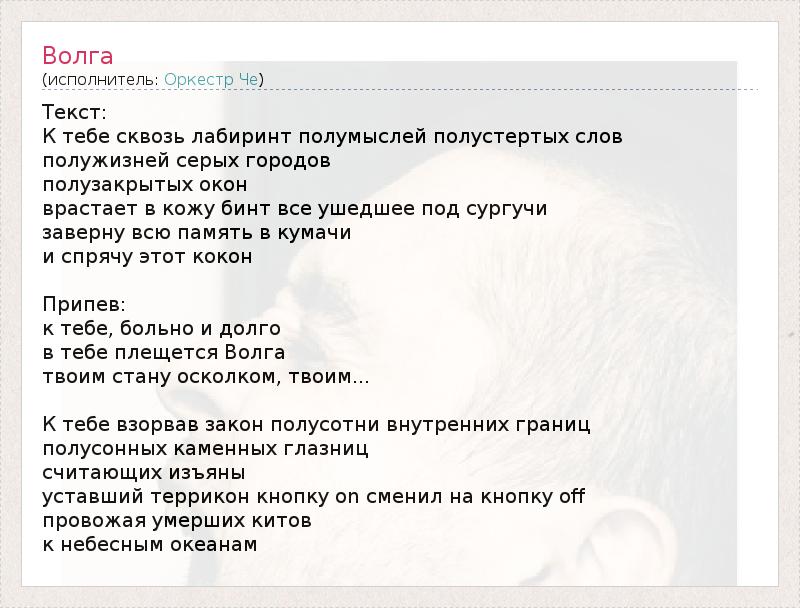 Текст: К тебе сквозь лабиринт полумыслей полустертых слов полужизней серых городов полузакрытых окон врастает в кожу бинт все ушедшее под сургучи заверну всю память в кумачи и спрячу этот кокон Припев: к тебе, больно и долго в тебе плещется Волга твоим стану осколком, твоим... К тебе взорвав закон полусотни внутренних границ полусонных каменных глазниц считающих изъяны уставший террикон кнопку on сменил на кнопку off провожая умерших китов к небесным океанам