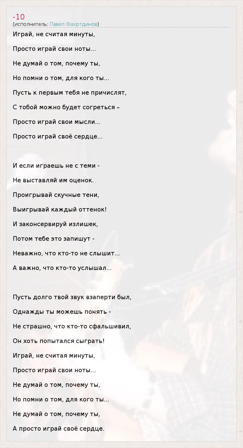Играй, не считая минуты, Просто играй свои ноты... Не думай о том, почему ты, Но помни о том, для кого ты... Пусть к первым тебя не причислят, С тобой можно будет согреться – Просто играй свои мысли... Просто играй своё сердце... И если играешь не с теми - Не выставляй им оценок. Проигрывай скучные тени, Выигрывай каждый оттенок! И законсервируй излишек, Потом тебе это запишут - Неважно, что кто-то не слышит... А важно, что кто-то услышал... Пусть долго твой звук взаперти был, Однажды ты можешь понять - Не страшно, что кто-то сфальшивил, Он хоть попытался сыграть! Играй, не считая минуты, Просто играй свои ноты... Не думай о том, почему ты, Но помни о том, для кого ты... Не думай о том, почему ты, А просто играй своё сердце.