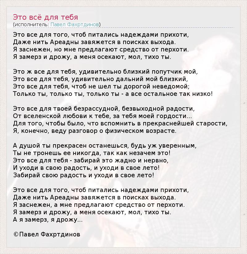 Это все для того, чтоб питались надеждами прихоти, Даже нить Ареадны завяжется в поисках выхода. Я заснежен, но мне предлагают средство от перхоти. Я замерз и дрожу, а меня осекают, мол, тихо ты. Это ж все для тебя, удивительно близкий попутчик мой, Это все для тебя, удивительно дальний мой близкий, Это все для тебя, чтоб не шел ты дорогой неведомой; Только ты, только ты, только ты - а все остальное так низко! Это все для твоей безрассудной, безвыходной радости, От вселенской любови к тебе, за тебя моей гордости... Для того, чтобы было, что вспомнить в прекраснейшей старости, Я, конечно, веду разговор о физическом возрасте. А душой ты прекрасен останешься, будь уж уверенным, Ты не тронешь ее никогда, так как незачем это! Это все для тебя - забирай это жадно и нервно, И уходи в свою радость, и уходи в свое лето! Забирай свою радость и уходи в свое лето! Это все для того, чтоб питались надеждами прихоти, Даже нить Ареадны завяжется в поисках выхода. Я заснежен, а мне предлагают средство от перхоти. Я замерз и дрожу, а меня осекают, мол, тихо ты. А я замерз, я дрожу... ©Павел Фахртдинов