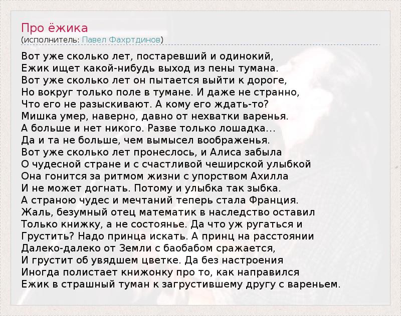 For many years , the aged and lonely, Hedgehog is looking for a way out of the foam fog. For many years, he tries to get to the road, But just around the field in a fog. And do not even strange, That it is not wanted . And who is it wait? Bear died , probably from lack of long jams . And more and there is none . Unless the horse ... And even that is no more than a fiction of the imagination. For how many years have flashed , and Alice forgot About wonderful country and with a happy smile Cheshire She chases the rhythm of life with perseverance Achilles And can not catch up . That's why so shaky smile . A wonderland of dreams and has now become France . Sorry , mad mathematician father left a legacy Only a book , not a state . Yes, that really swear and Sad? We must look for the prince . A prince from a distance Far, far away from the Earth with the baobab fights And sad about the fading flower . Yes no mood Sometimes Polistayte little book about how headed Hedgehog in the fog to the terrible sad friend with jam .