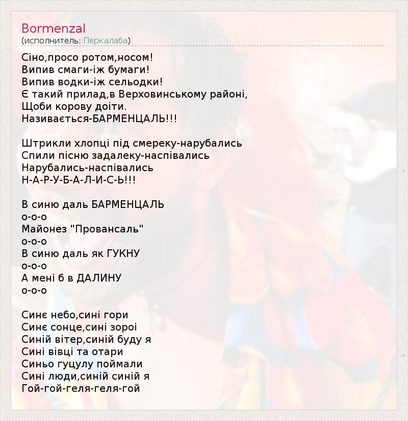 Сiно,просо ротом,носом! Випив смаги-iж бумаги! Випив водки-iж сельодки! Є такий прилад,в Верховинському районi, Щоби корову доiти. Називається-БАРМЕНЦАЛЬ!!! Штрикли хлопцi пiд смереку-нарубались Спили пiсню задалеку-наспiвались Нарубались-наспiвались Н-А-Р-У-Б-А-Л-И-С-Ь!!! В синю даль БАРМЕНЦАЛЬ о-о-о Майонез "Провансаль" о-о-о В синю даль як ГУКНУ о-о-о А менi б в ДАЛИНУ о-о-о Синє небо,синi гори Синє сонце,синi зорoi Синiй вiтер,синiй буду я Синi вiвцi та отари Синьо гуцулу поймали Синi люди,синiй синiй я Гой-гой-геля-геля-гой