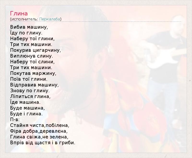 Вибив машину, Їду по глину. Наберу тої глини, Три тих машини. Покурив цигарчину, Виплюнув слину. Наберу тої слини, Три тих машини. Покутав маржину, Поїв тої глини. Відправив машину, Знову по глину. Ліпиться глина, Їде машина. Буде машина, Буде і глина. П-в: Стайня чиста,побілена, Фіра добра,деревлєна, Глина свіжа,не зелена, Впрів від щастя і в гриби.
