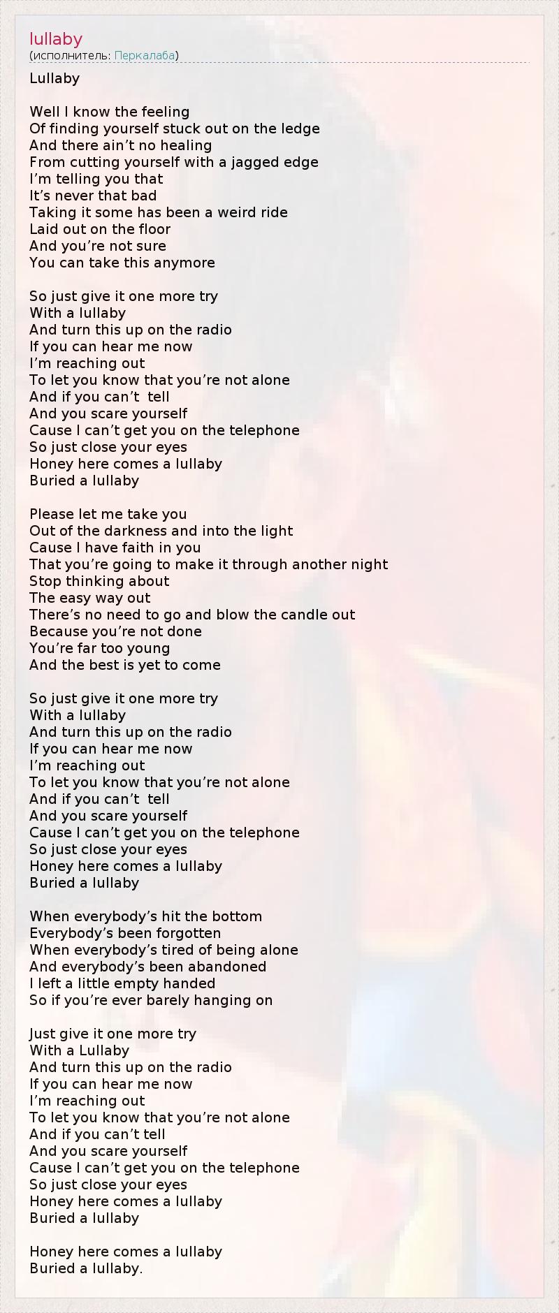 Колыбельная. Да, я знаю это ощущение, Когда ты оказываешься застрявшим на краю. И нет исцеления, От порезов об острый край. И я говорю тебе, что Это не так уж плохо, Учитывая, какой странной была гонка. Развалившись на полу, Ты не уверена, что сможешь осилить её еще раз. Просто дай ещё одну попытку, С этой колыбельной. И она окажется на радио! Если ты слышишь меня сейчас, Значит, я дотягиваюсь до тебя, Чтобы дать тебе знать, что ты не одинока. И если ты не можешь говорить, Если ты пугаешься, Потому что я не могу убедить тебя по телефону, - Просто закрой глаза. Милая, вот и колыбельная, Ты погрузилась в колыбельную. Пожалуйста, дай мне вытащить тебя из тьмы на свет. Потому что я верю в тебя, в то, что ты собираешься сделать это следующей ночью. Перестань думать о легком выходе. Нет необходимости уходить и задувать свечу Потому что ты не закончила. Ты ещё так молода И лучшее ещё впереди. Просто дай ещё одну попытку, С этой колыбельной. И она окажется на радио! Если ты слышишь меня сейчас, Значит, я дотягиваюсь до тебя, Чтобы дать тебе знать, что ты не одинока. И если ты не можешь говорить, Если ты пугаешься, Потому что я не могу убедить тебя по телефону, - Просто закрой глаза. Милая, вот и колыбельная, Ты погрузилась в колыбельную. Когда ты достигла дна, когда ты позабыта, Когда ты устала от одиночества, И когда ты покинута, Знай, я оставил немного пространства в руках, На случай, если ты когда-нибудь будешь висеть на волоске. Просто дай ещё одну попытку, С этой колыбельной. И она окажется на радио! Если ты слышишь меня сейчас, Значит, я дотягиваюсь до тебя, Чтобы дать тебе знать, что ты не одинока. И если ты не можешь говорить, Если ты пугаешься, Потому что я не могу убедить тебя по телефону, - Просто закрой глаза. Милая, вот и колыбельная, Ты погрузилась в колыбельную. Милая, вот и колыбельная, Ты погрузилась в колыбельную.