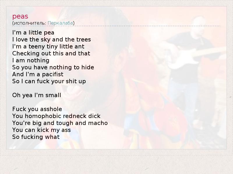 Я - крохотная горошинка. Люблю небо и деревья. Я, как мелкий муравей, Собираю то и это. Но я - ничто, Так что тебе незачем ничего скрывать. И да: я пацифист, Так что могу вы*бать тебя. О, да-а-а. Я мала. Сдохни, урод! Ты - неотёсанный х*р-гомофоб! Ну, окей, ты большой и сильный мачо И даже можешь отмуд*хать меня - Дальше что?