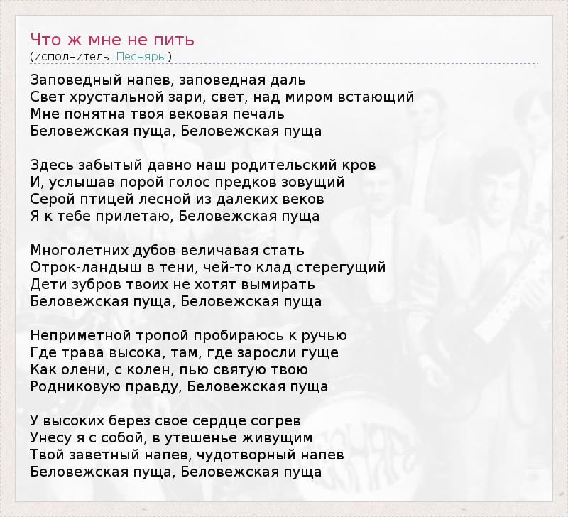 Заповедный напев, заповедная даль Свет хрустальной зари, свет, над миром встающий Мне понятна твоя вековая печаль Беловежская пуща, Беловежская пуща Здесь забытый давно наш родительский кров И, услышав порой голос предков зовущий Серой птицей лесной из далеких веков Я к тебе прилетаю, Беловежская пуща Многолетних дубов величавая стать Отрок-ландыш в тени, чей-то клад стерегущий Дети зубров твоих не хотят вымирать Беловежская пуща, Беловежская пуща Неприметной тропой пробираюсь к ручью Где трава высока, там, где заросли гуще Как олени, с колен, пью святую твою Родниковую правду, Беловежская пуща У высоких берез свое сердце согрев Унесу я с собой, в утешенье живущим Твой заветный напев, чудотворный напев Беловежская пуща, Беловежская пуща