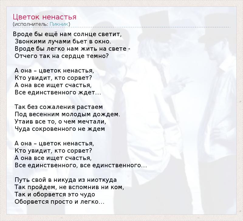 Вроде бы ещё нам солнце светит, Звонкими лучами бьет в окно. Вроде бы легко нам жить на свете - Отчего так на сердце темно? А она – цветок ненастья, Кто увидит, кто сорвет? А она все ищет счастья, Все единственного ждет… Так без сожаления растаем Под весенним молодым дождем. Утаив все то, о чем мечтали, Чуда сокровенного не ждем А она – цветок ненастья, Кто увидит, кто сорвет? А она все ищет счастья, Все единственного, все единственного… Путь свой в никуда из ниоткуда Так пройдем, не вспомнив ни ком, Так и оборвется это чудо Оборвется просто и легко…