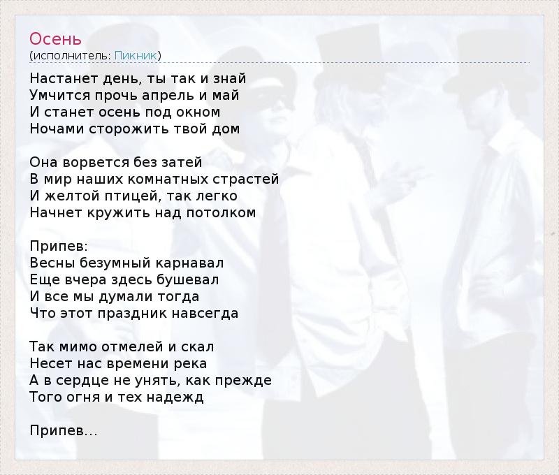 Это интересно:Хотя газетный эпитет "удивительная судьба" уже давно стал общим местом и едва ли способен отразить реальное положение дел, судьба "Пикника", одной из самых популярных групп, рождённых музыкальной сценой Питера, и верно - исключительно своеобразна и неповторима: с одной стороны, плоть от плоти местной рок-культуры, он прошёл всеми типичными для неё путями и испытал на себе все... продолжение