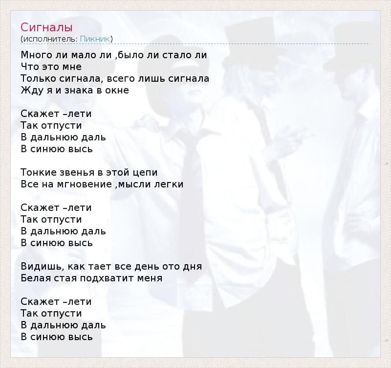 Много ли мало ли ,было ли стало ли Что это мне Только сигнала, всего лишь сигнала Жду я и знака в окне Скажет –лети Так отпусти В дальнюю даль В синюю высь Тонкие звенья в этой цепи Все на мгновение ,мысли легки Скажет –лети Так отпусти В дальнюю даль В синюю высь Видишь, как тает все день ото дня Белая стая подхватит меня Скажет –лети Так отпусти В дальнюю даль В синюю высь