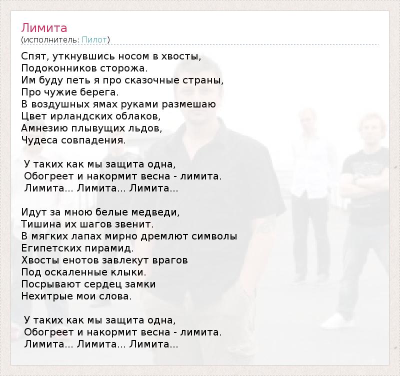 Это интересно:Группа "Пилот" образовалась 11 января 1997 года в первоначальном составе: Илья Чёрт (вокал), Ромка Чуйков (гитара), Стасики Маркофф (бас), Витя Кузьмичёв (барабаны) плюс комсостав в лице директора Карпенкова Валерия Константиновича. На дне рождения группы, который проходил в концертном зале Полигон, играли приглашенные дружественные коллективы... продолжение