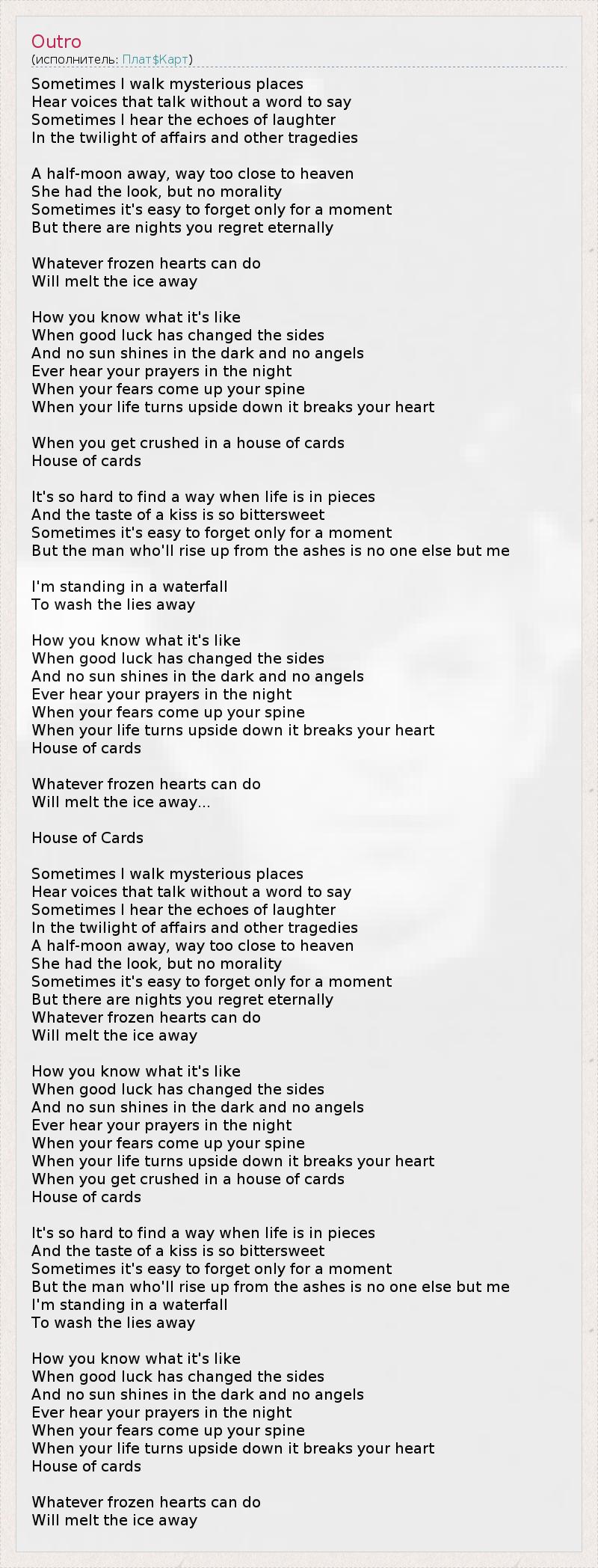 Часто брожу в загадочных чащах, Там речи в лесу, они звучат без слов, Слышу смех игр, и эхом летящий Тает сумрак из интриг и разных прочих драм... Луна там вдали, но близок путь до неба. Ей мало лет, но так порочен нрав. Порой ты жаждешь всё забыть, просто как мгновенье, Но есть же ночь - твой секрет, навечно он. Но даже в холод стук сердец Растопит лед всегда Мог ли знать, что вот так Вмиг судьба не друг, а враг, И нет солнца, только мрак, даже ангел Ночью где-то спрятан в небесах, До костей пронзает страх Если жизнь вся кувырком, и ты разбит. И вновь лежит твой дом из карт. Дом из карт. Я готов найти свой путь, раз жизнь так разбита. Лишь тот вкус, поцелуй - как горький мёд... Порой ты жаждешь всё забыть, просто как мгновенье Но я тот, кто может встать из пепла, и я иду вперёд. Я встану вновь под водопад Вся ложь уйдёт пускай. Мог ли знать, что вот так Вмиг судьба не друг, а враг, И нет солнца, только мрак, даже ангел Ночью где-то спрятан в небесах, До костей пронзает страх Если жизнь вся кувырком, и ты разбит. Дом из карт... Но даже в холод стук сердец Растопит лед всегда... Карточный домик (перевод Margaret Korsakova) Иногда я брожу в удивительных местах И слышу голоса, разговаривающие без слов, Иногда я слышу эхо смеха В сумерках интриг и трагедий, На полдороге от луны, совсем близко до неба. Она была красива, но не обременена моралью... Иногда об этом просто забыть на какое-то мгновение, А есть ночи, о которых ты будешь жалеть целую вечность, Но то, что сделают замерзшие сердца, Растопит лед Откуда тебе знать каково это, Когда удача отвернулась от тебя, И солнце не светит в темноте, и ангелы В ночи не слышат твои молитвы? Когда тебя пробирает страх, Твоя жизнь переворачивается с ног на голову, и это разбивает тебе сердце, Когда ты оказываешься под обломками карточного домика Карточного домика Так сложно найти свой путь, когда жизнь развалилась на части, А поцелуй кажется таким горько-сладким. Иногда об этом просто забыть на какое-то мгновение, Но я буду тем, кто поднимется из пепла. Я стою под водопадом, Смывающим ложь. Откуда тебе знать каково это, Когда удача отвернулась от тебя, И солнце не светит в темноте, и ангелы В ночи не слышат твои молитвы? Когда тебя пробирает страх, Твоя жизнь переворачивается с ног на голову, и это разбивает тебе сердце, Когда ты оказываешься под обломками карточного домика Карточного домика Но то, что сделают замерзшие сердца, Растопит лед.