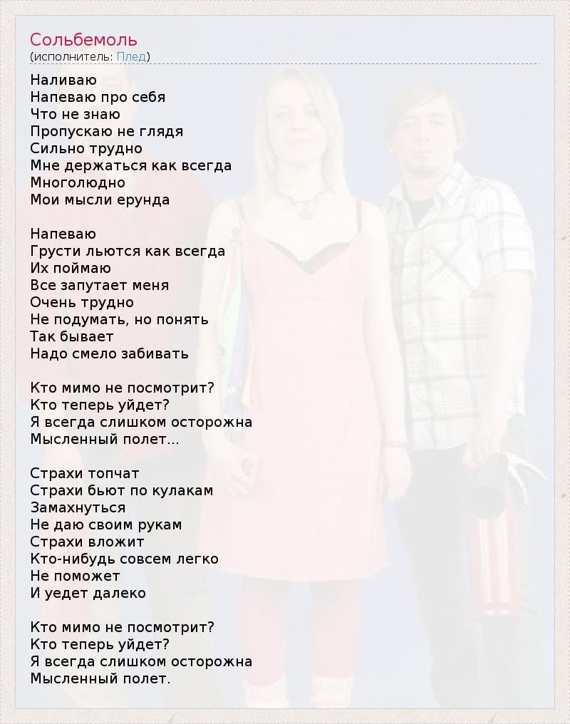 Наливаю Напеваю про себя Что не знаю Пропускаю не глядя Сильно трудно Мне держаться как всегда Многолюдно Мои мысли ерунда Напеваю Грусти льются как всегда Их поймаю Все запутает меня Очень трудно Не подумать, но понять Так бывает Надо смело забивать Кто мимо не посмотрит? Кто теперь уйдет? Я всегда слишком осторожна Мысленный полет... Страхи топчат Страхи бьют по кулакам Замахнуться Не даю своим рукам Страхи вложит Кто-нибудь совсем легко Не поможет И уедет далеко Кто мимо не посмотрит? Кто теперь уйдет? Я всегда слишком осторожна Мысленный полет.