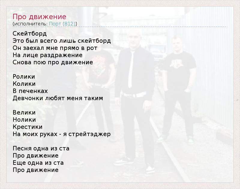 Это интересно:Порт (812) — российская панк-группа, образованная в 1999 году солистом группы Маррадёры, Ильёй Никитиным.Первоначально образовалась группа Маррадёры (осень 1992), которая играла хардкор. Первый настоящий концерт состоялся в июне 1993. От первоначального состава остался только Илья, тот кто пишет всю музыку и все тексты. Группа выпустила 5 альбомов, участвовала во многих сборниках, активно... продолжение