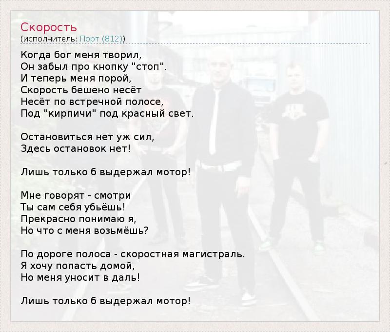 Когда бог меня творил, Он забыл про кнопку "стоп". И теперь меня порой, Скорость бешено несёт Несёт по встречной полосе, Под "кирпичи" под красный свет. Остановиться нет уж сил, Здесь остановок нет! Лишь только б выдержал мотор! Мне говорят - смотри Ты сам себя убьёшь! Прекрасно понимаю я, Но что с меня возьмёшь? По дороге полоса - скоростная магистраль. Я хочу попасть домой, Но меня уносит в даль! Лишь только б выдержал мотор!