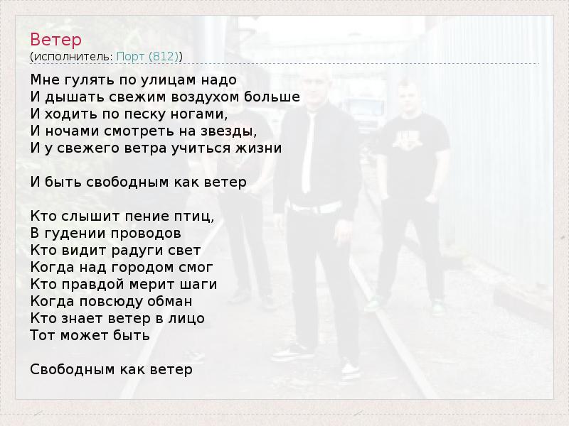 Мне гулять по улицам надо И дышать свежим воздухом больше И ходить по песку ногами, И ночами смотреть на звезды, И у свежего ветра учиться жизни И быть свободным как ветер Кто слышит пение птиц, В гудении проводов Кто видит радуги свет Когда над городом смог Кто правдой мерит шаги Когда повсюду обман Кто знает ветер в лицо Тот может быть Свободным как ветер